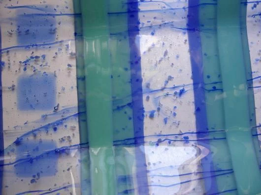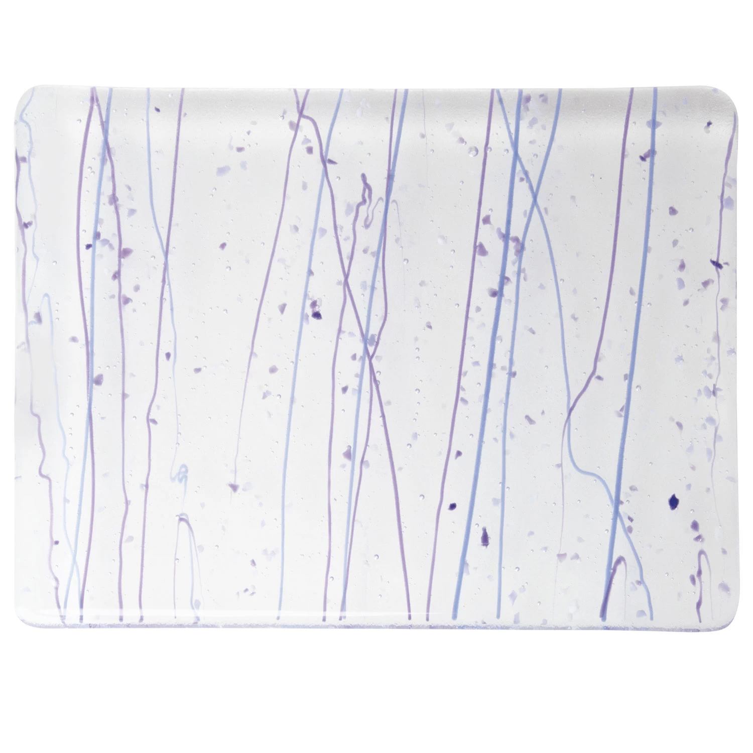 Mardi Gras sheets combine a colorful sprinkling of frits with glass threads of stringers – that fuse, twist and curve under the force of the clear molten glass into a lively cascade reminiscent of Carnival or ticker tape parades. Great for backgrounds or accents! Features a mix of purple and blue on clear base glass. Single-rolled “Catspaw” transparent fusibles have slightly knobby textured backs and pointillistic light transmission. Standard thickness 3mm. 90 COE.