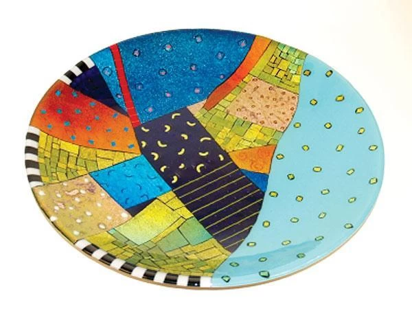 Platter created by artist Stephen Palmer using Bullseye and dichroic glass, from Delphi’s Online Artist Gallery.Â