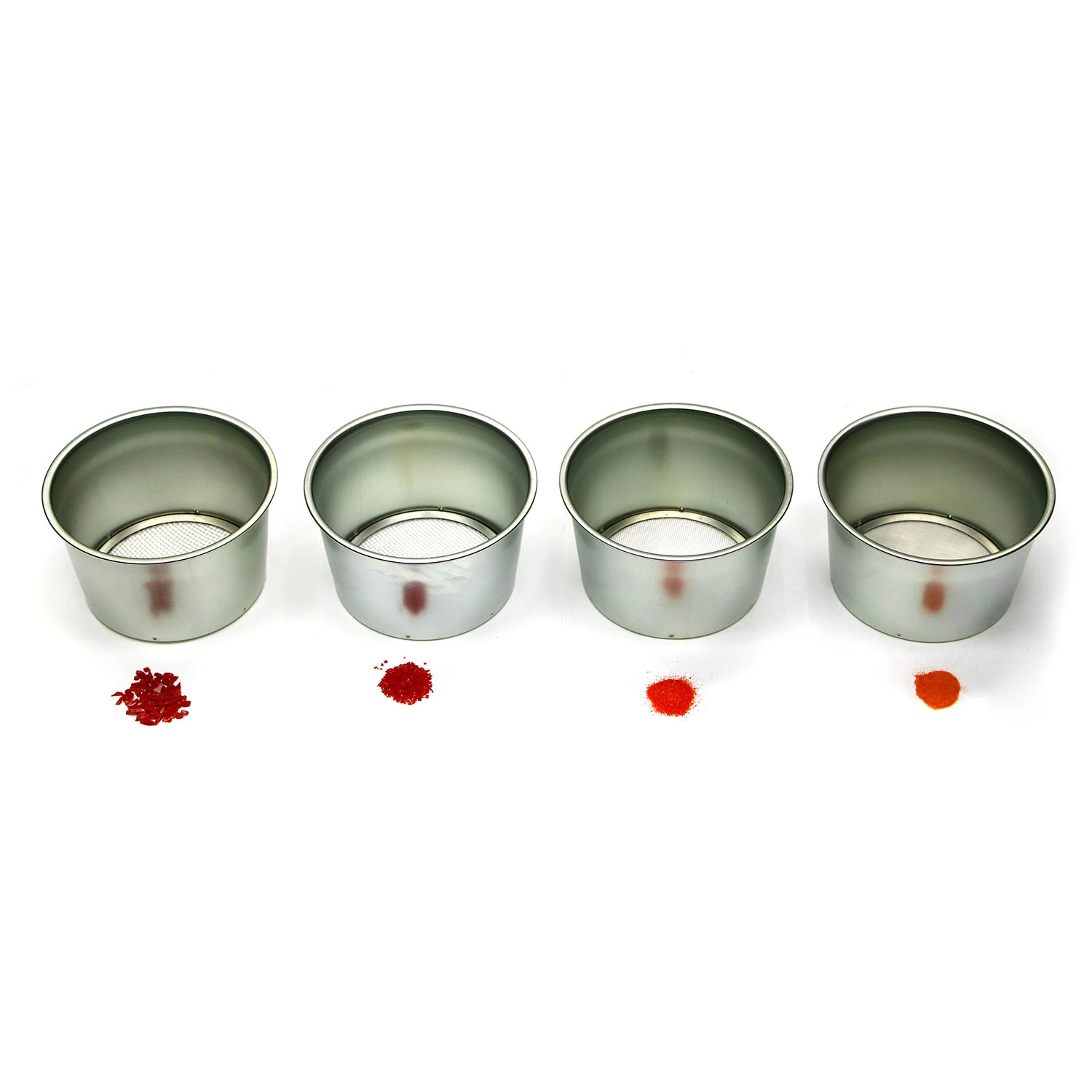 An indispensable companion to Aanraku Frit Piston (item #63998) Simply sift the frit you create to separate powder, fine, medium and coarse grit sizes. Set of 4 nickel-plated zinc sifters, each with a different stainless steel mesh bottom. Mesh sizes range from powder to coarse, for quick and easy sifting. Measures 4-1/2″ in diameter by 3-3/4″ high. See additional images to view a close up.