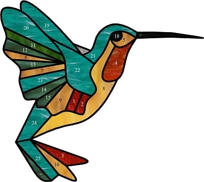 - Experiment with different glass colors and textures in your design to visualize your creation before cutting a single piece. Glass Eye 2000 can number all your pieces instantly. For example see the numbered Hummingbird pattern below.