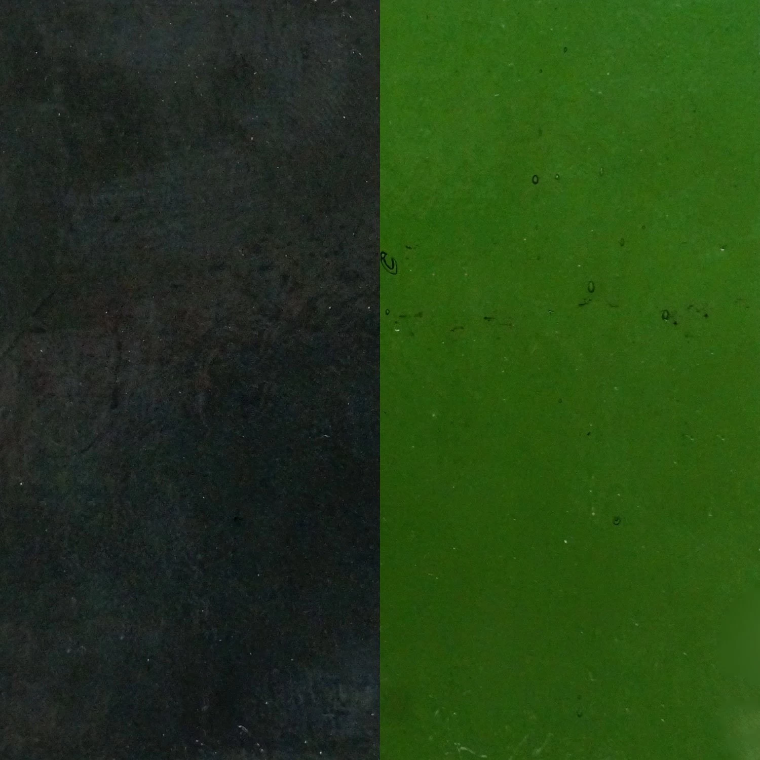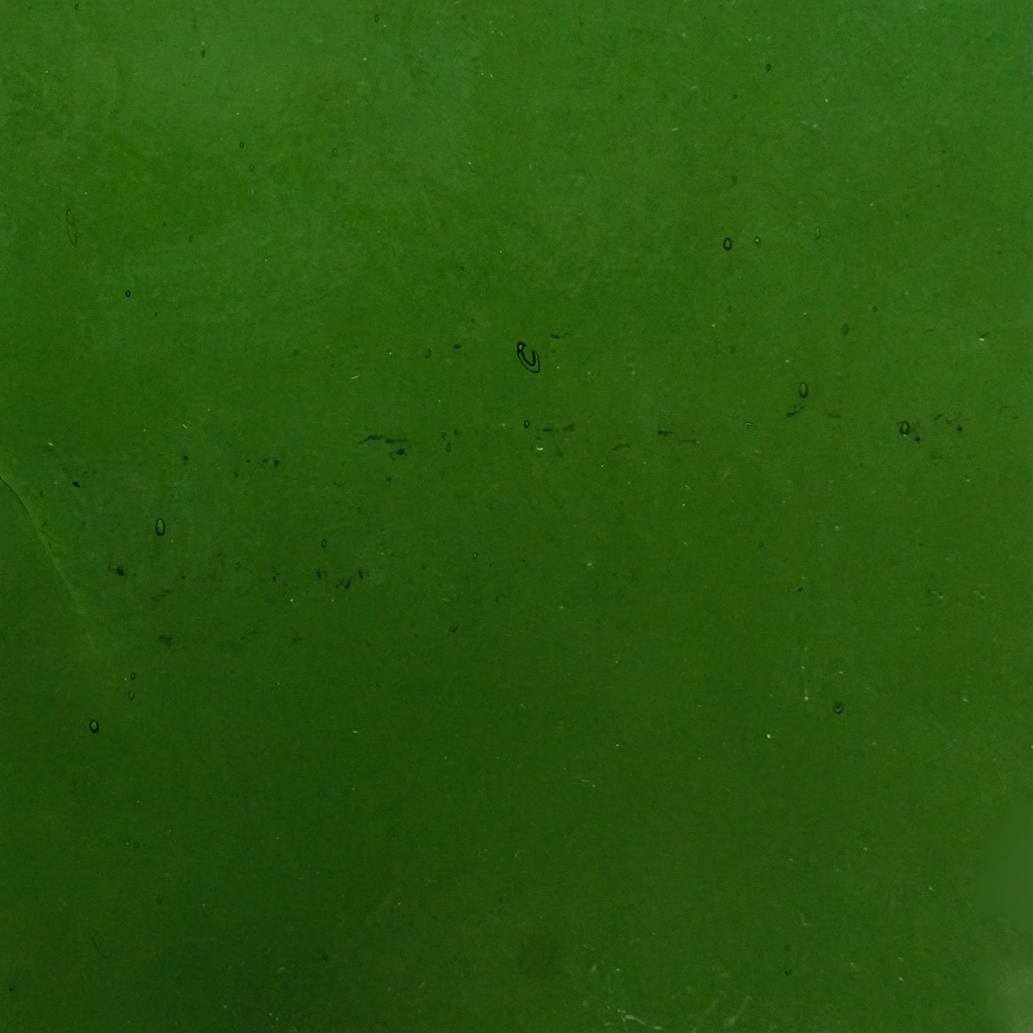 Glass swatches are a 2″ square to better show detail. Main image shows glass unlighted. Second image shows glass backlit. Third image shows both views collaged together – right side of image shows light transmission.