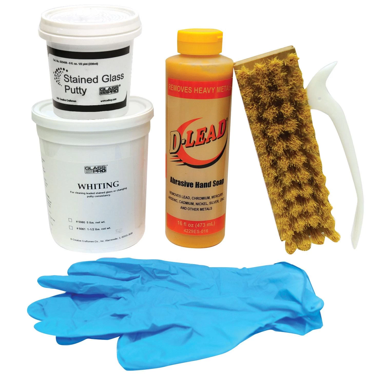 Kit includes 1/2 pint of black putty, 1-1/2 lbs of Whiting Powder, scrub brush, fid, 5 pair of disposable gloves and D-Lead hand soap. Achieving professional results are easy with this Delphi exclusive kit!