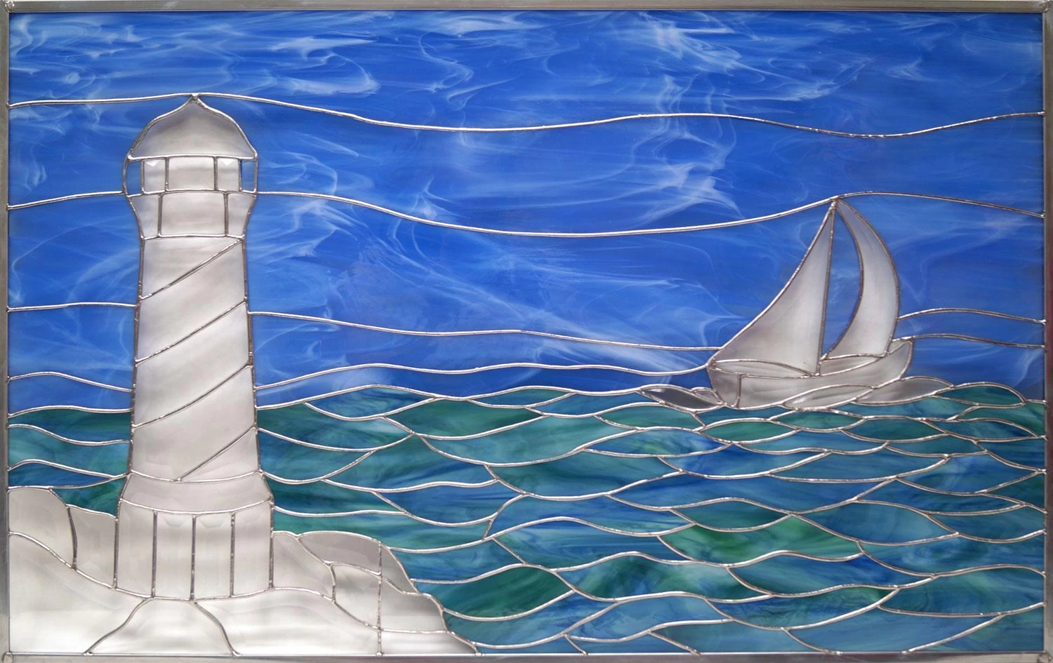 Lighthouse and sailboat panel by artist Steena Gaut.