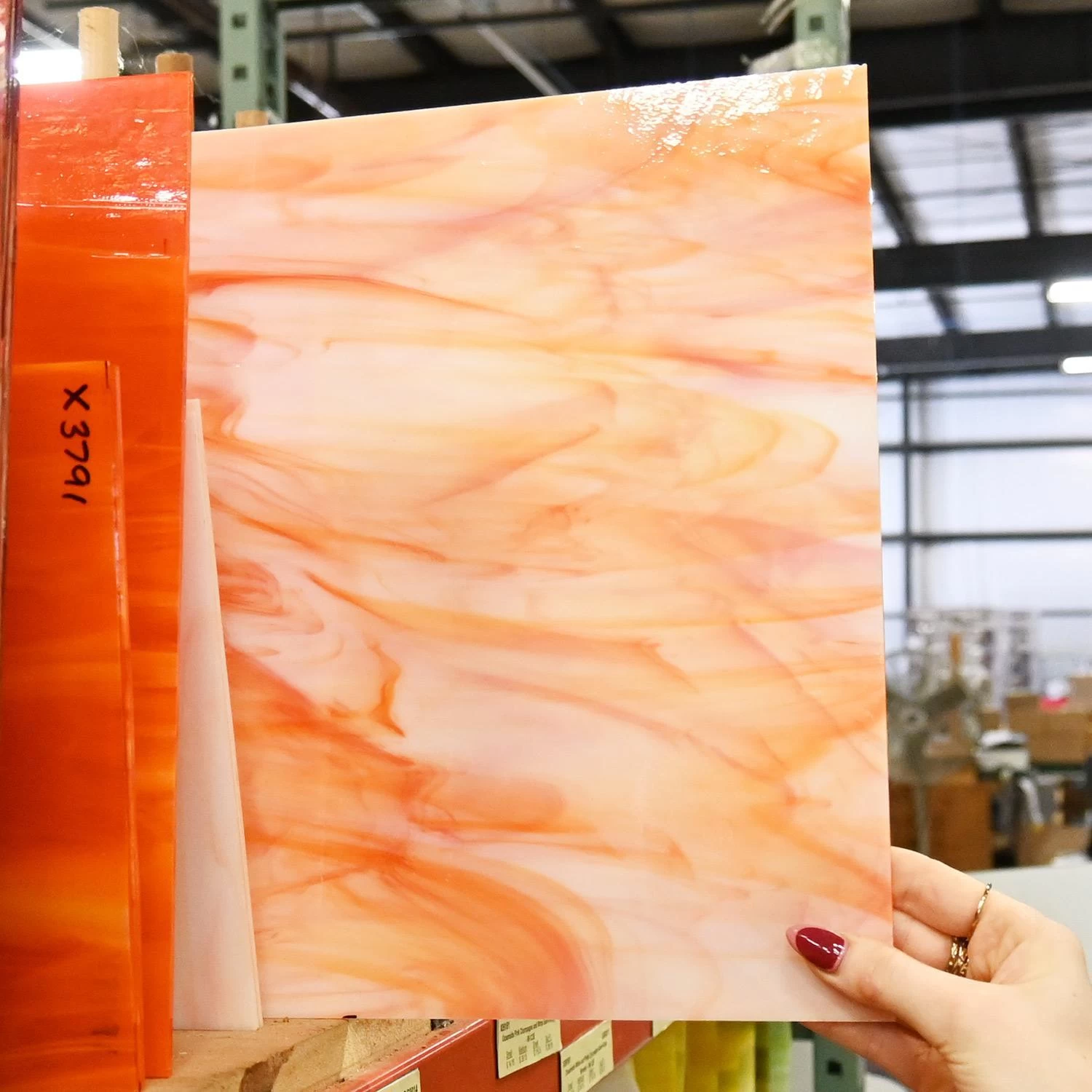 Oceanside’s Wispy line offers transparent colored glass swirled with white opal streaks mixed throughout. Semi-transparent glass offers lower light transmission and more distortion – good for projects where you want a little movement but more light to show through.Â