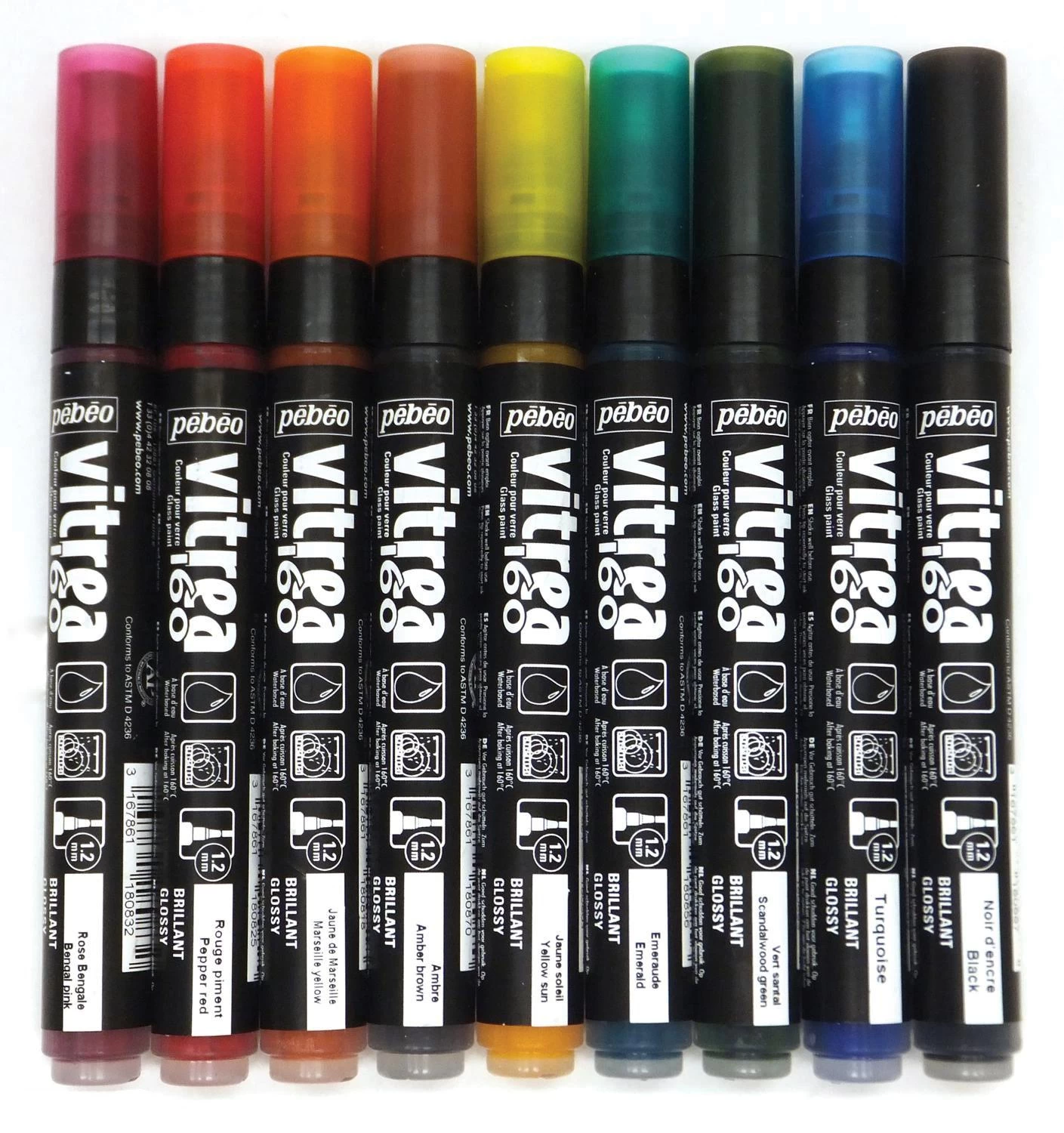 Use paint markers with Pebeo paints and outliners. The medium-size round tip makes drawing, writing and outlining a breeze. Set includes 9 markers.