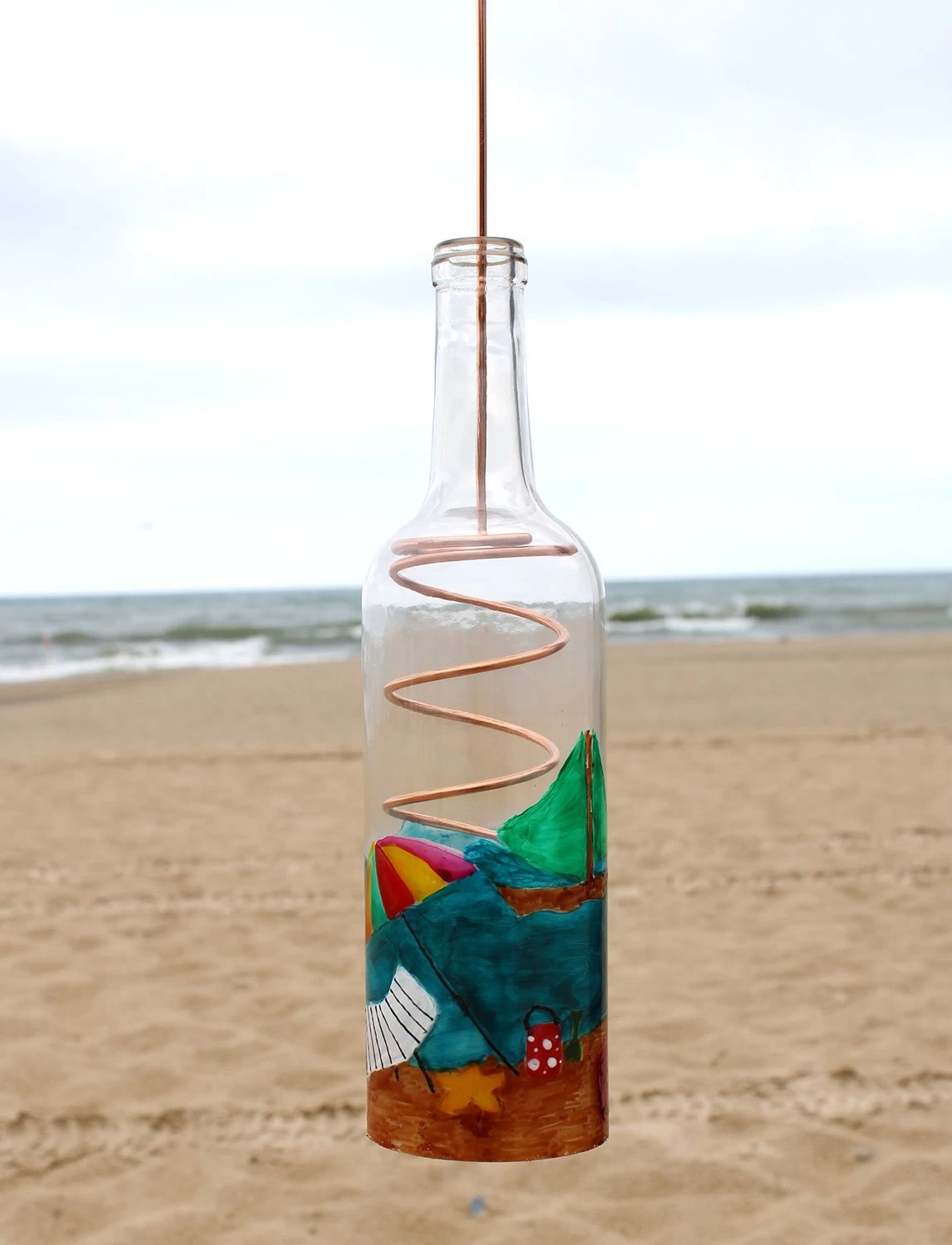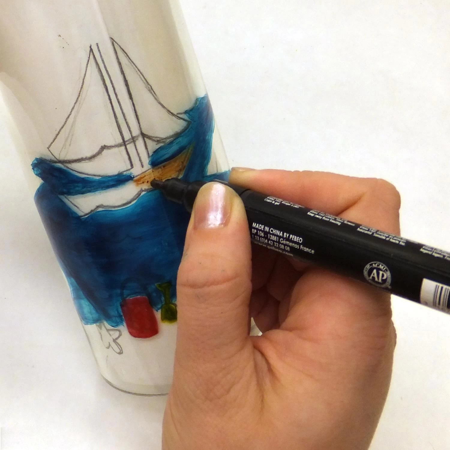 Paint markers are a fun and easy way to create personalize gifts, as shown. Image of marker in use from “Creative Glass Painting” #6976. Beach bottle votive project by artist Kayleigh Clark. Â