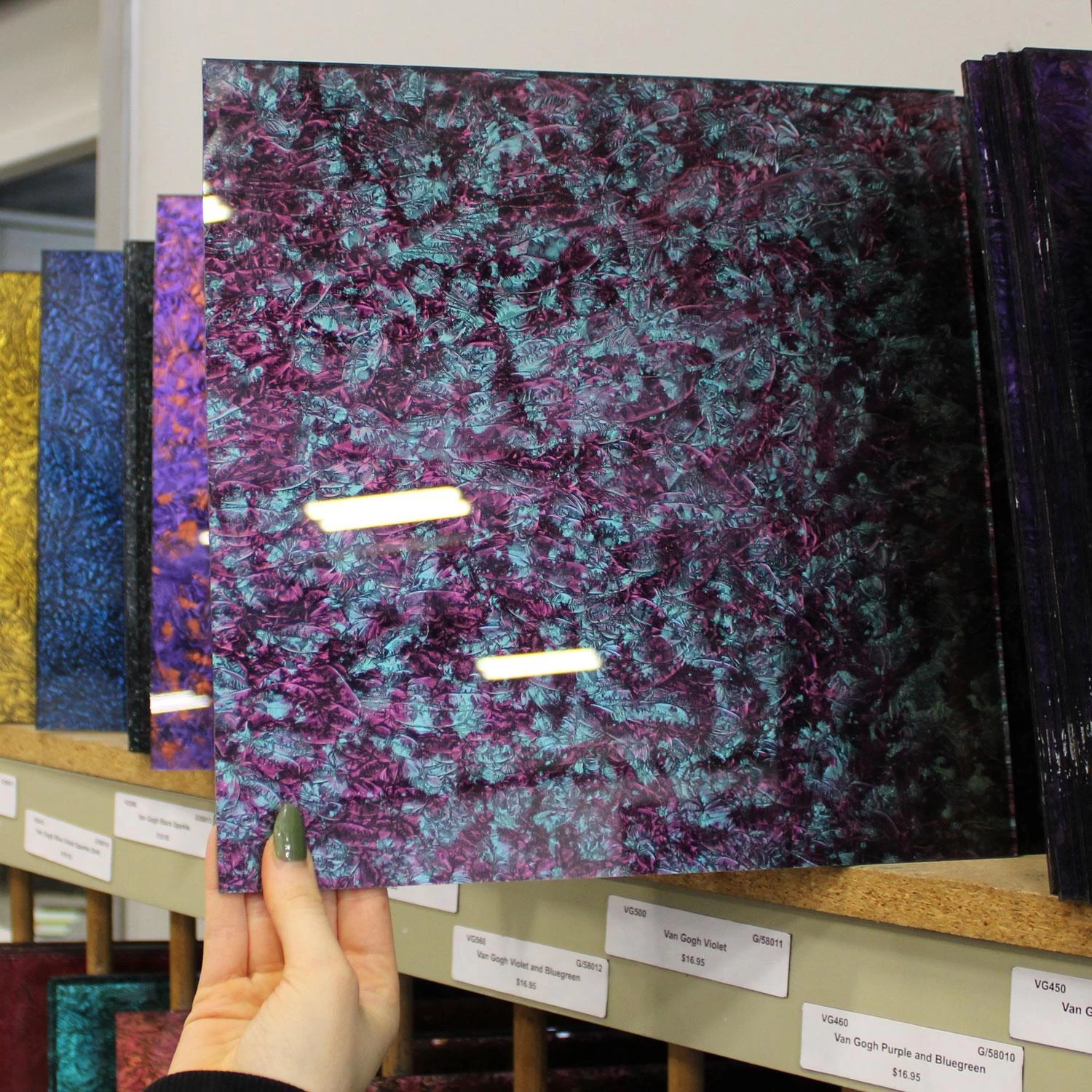 Create with this stunningly different glass! Van Gogh features a smooth front surface and a gently textured reverse side that is coated with gorgeous color and sparkle. The durable coating will not chip when cutting and provides excellent opacity for making mosaics, stained glass boxes and more. All Van Gogh glass is handmade, which means actual glass may vary slightly from photo. Sold in 12″ x 12″ pieces.