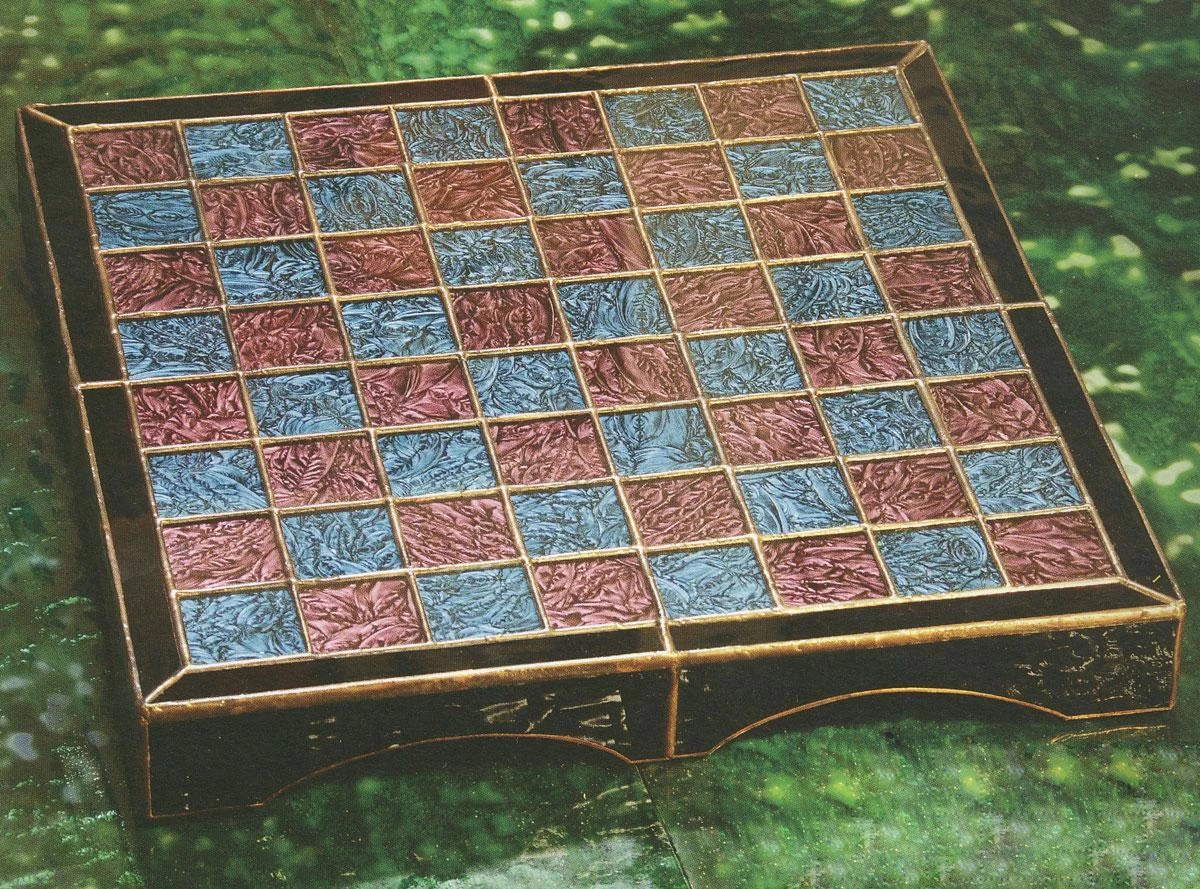 Mosaic vase and vanity projects created by artist and Delphi guest instructor Tom Snyder. Mosaic rose table by artist Keturah Esch. Stained glass checker board created by artist Michael Johnson. From “40 Great Stained Glass Projects” book #6324.