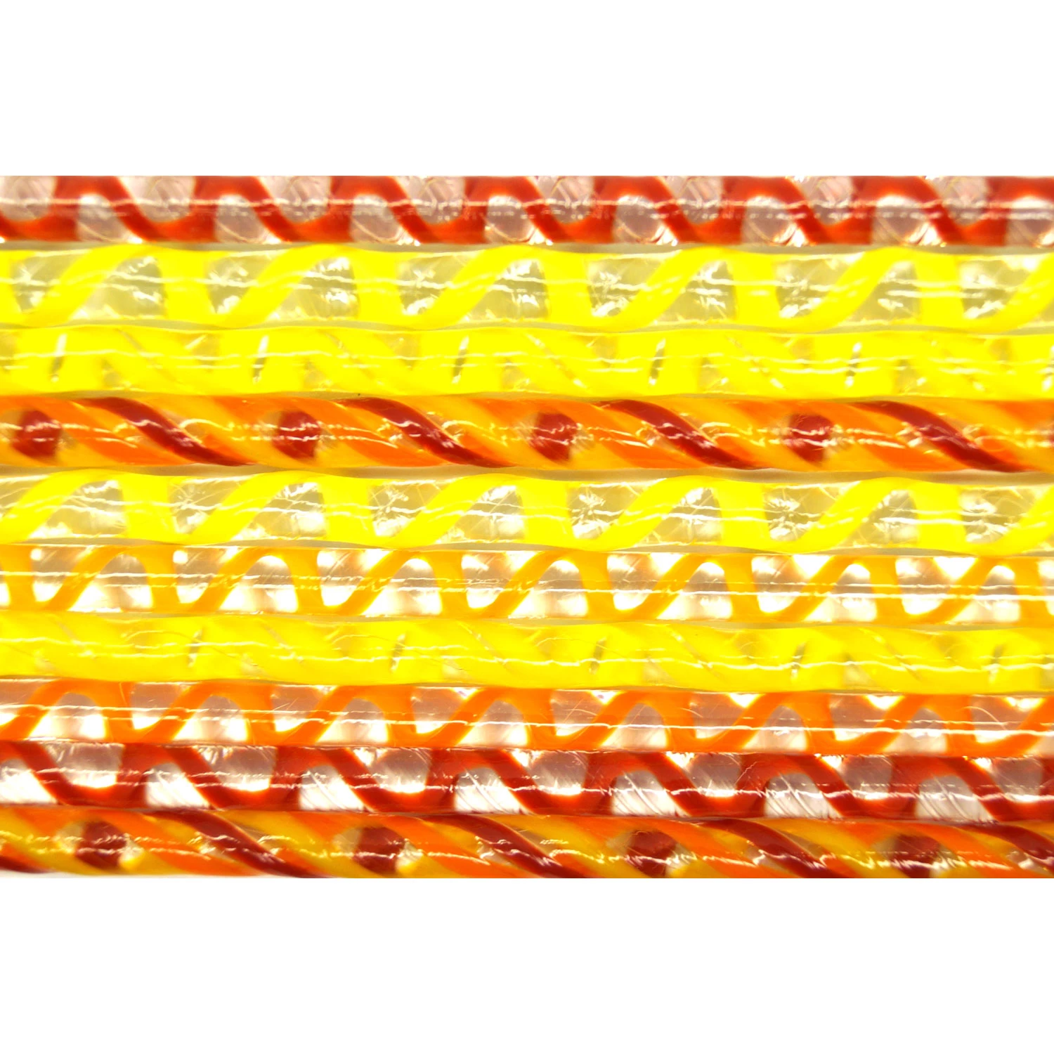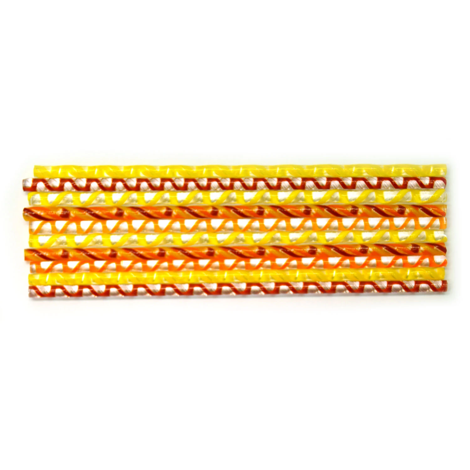 Fun warm colored striped rods are made from premium glass. Use to create fun borders and accents in fused projects. Cane are approximately 4mm to 7mm diameter x 5″ long. 10 pieces. 96 COEÂ