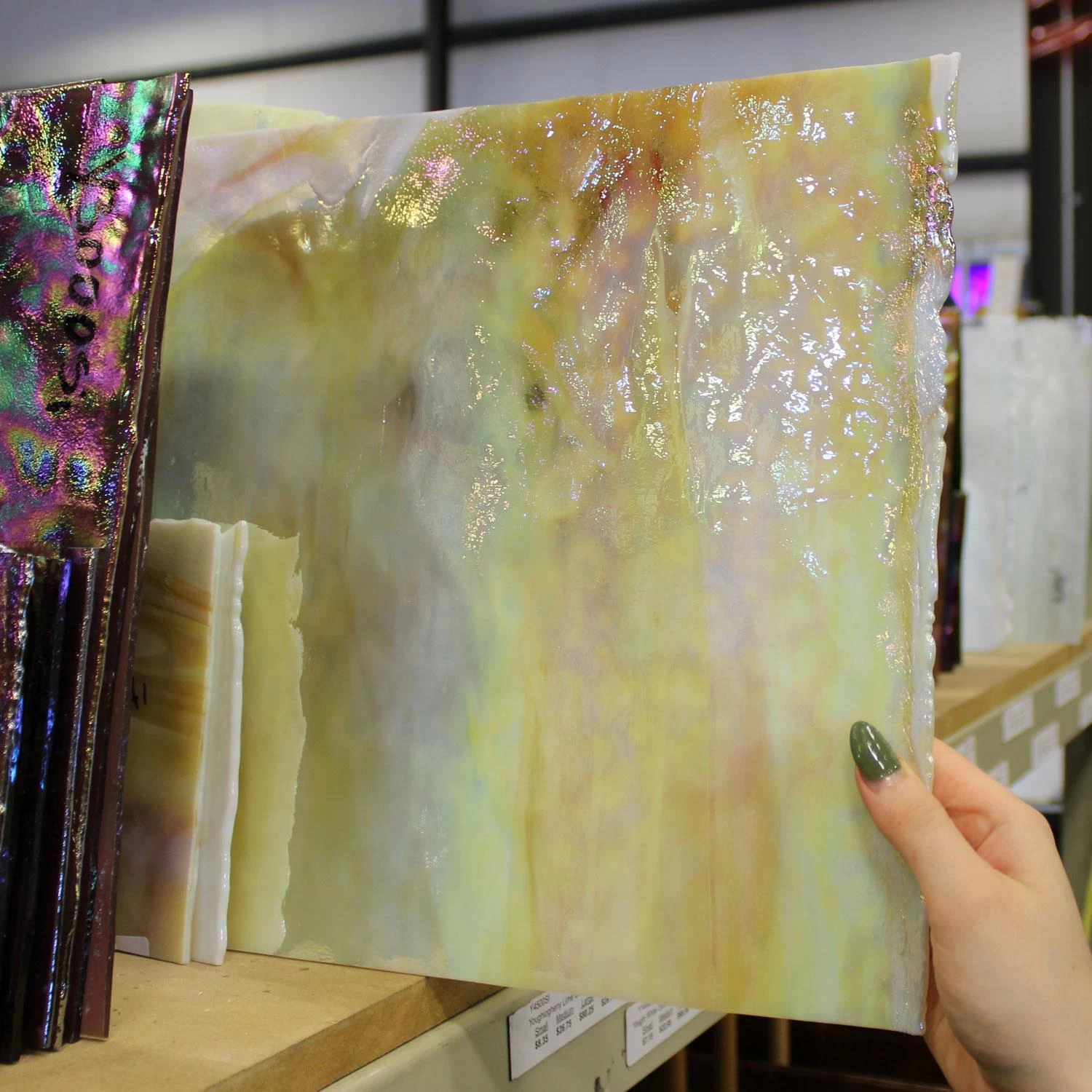 Add an extra dimension of beauty to your art. This iridized glass gives off a rainbow of colors! Great for accents or backgrounds.
